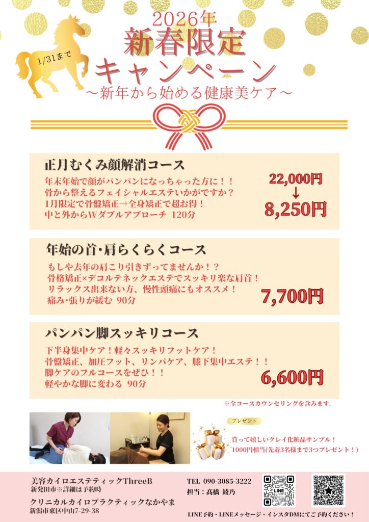 美容カイロの通常フェイシャルコースの骨盤矯正が1月限定で全身骨格矯正に!